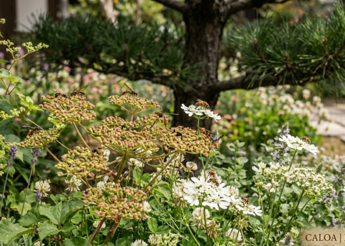 ヤブガラシが庭を覆い尽くすのが心配な場合は、同じように「蜜が浅い場所にある花」を意識して植えるのが賢明です。例えばセリ科(オルレアやハーブのフェンネルなど)は、平らな白い花を咲かせ、口の短い小さな寄生蜂たちも容易に蜜を吸うことができます。シソ科のハーブはミツバチを呼び、セリ科は松の守護者を呼ぶ。そうした**「多層的な食堂」**を庭に作ることが、知的な管理と言えるでしょう。